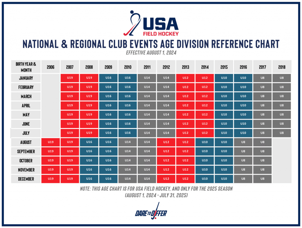 At times, players may play up, but under no circumstances can a player play down a level. USFHA age brackets go by the year of birth and have nothing to do with school grade. The “U” stands for Under. A player’s age group for the fall/winter/spring club seasons is determined by what age they are at the beginning of the calendar year. For example, a player that turns 14 in December 2022 is considered U16 for the Fall of 2024, the Winter of 2024-2025, and the Spring of 2025.